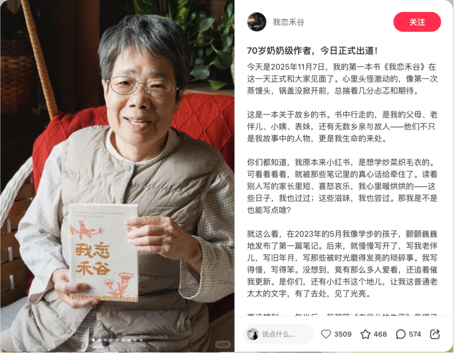 大赛挖掘出不少“小红书养成系作者”。大赛“岁月纪实奖”得主、70岁奶奶王玉珍最近刚出书了其第一册书,书名《我恋禾谷》便取自她的小红书网名,她称其“无体裁慧根,无翰墨功底”,但她笔下的身边东说念主被作者梁晓宣称为“信得过的东说念主世间”。